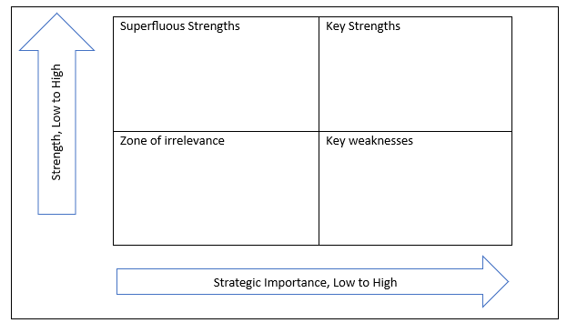 - Superfluous Strength: Strength rated 6 – 10; Strategic importance rated 1 – 5